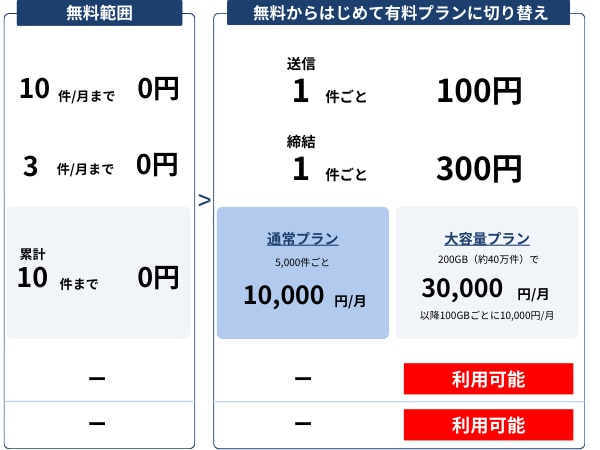 | 電子契約締結機能 | 0円 様々な締結方法に対応、署名依頼メールの再送や文書テンプレートなど電子契約がスムーズに行える機能が豊富。詳細はこちら |